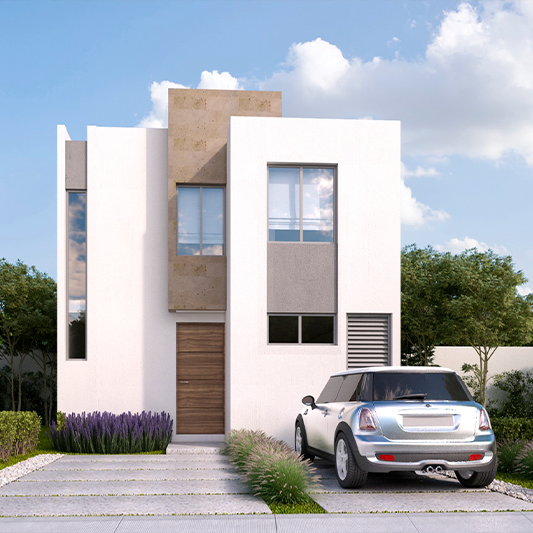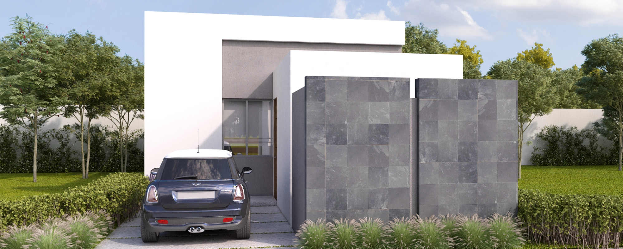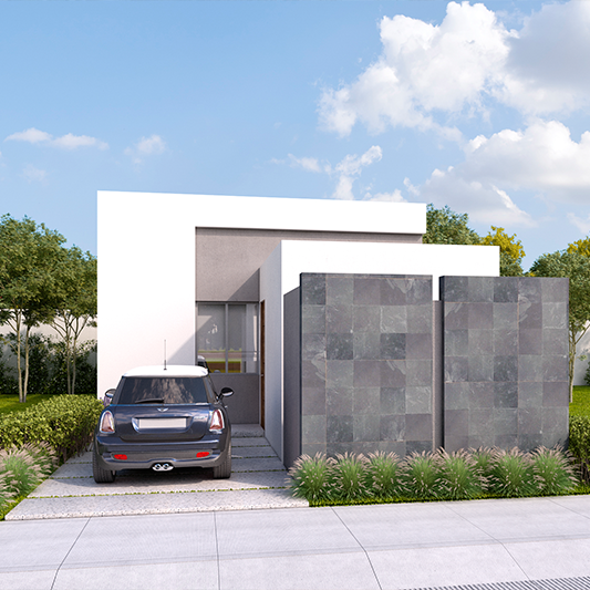 Este diseño se caracteriza por su estructura compacta y líneas rectas, con un énfasis en la privacidad gracias a un muro de piedra que oculta parcialmente la fachada. La entrada es discreta y cuenta con un espacio de estacionamiento frontal.