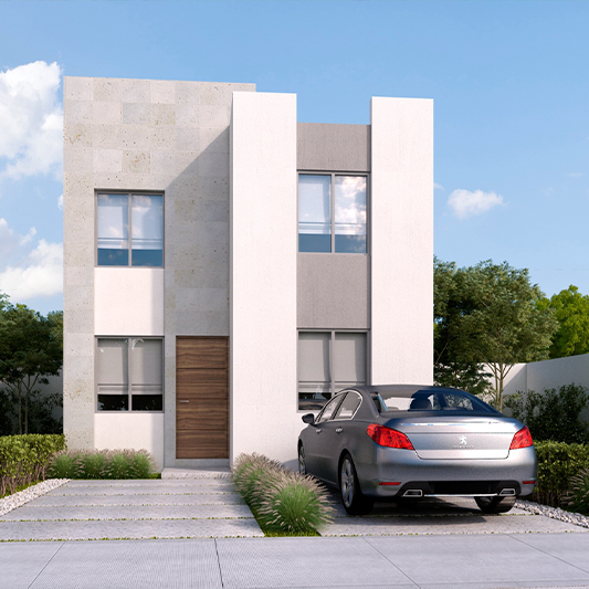 Esta versión tiene una variación en los materiales de revestimiento, con una mayor presencia de piedra en tonos grises. Su diseño ofrece una apariencia sofisticada y moderna, con amplias ventanas y un acceso cómodo para vehículos.